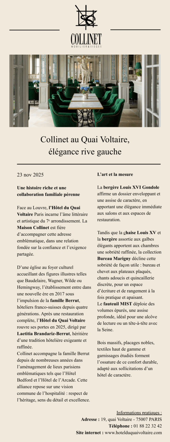 Nous avons eu le plaisir d’être à l’honneur dans le magazine @eventail.be ! L’Hotel du Quai Voltaire séduit par son élégance et son histoire singulière.